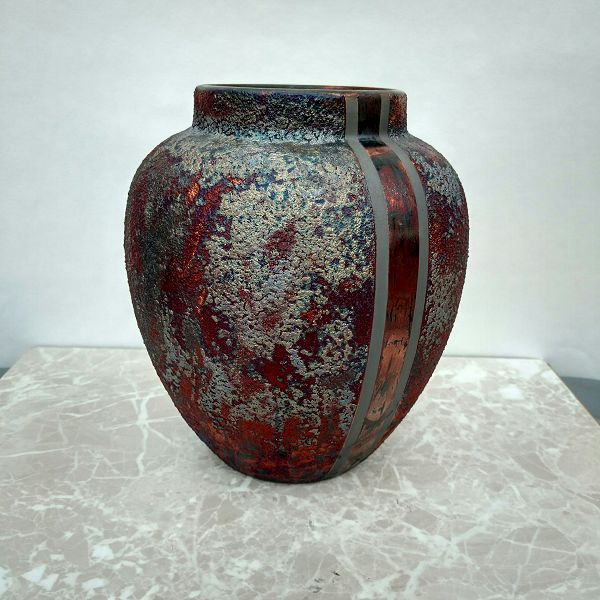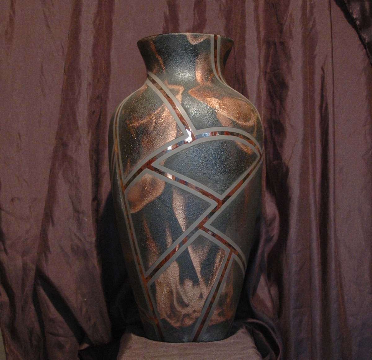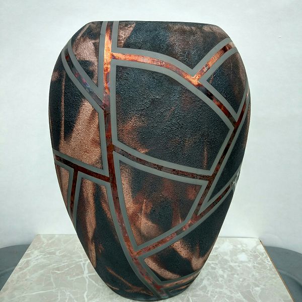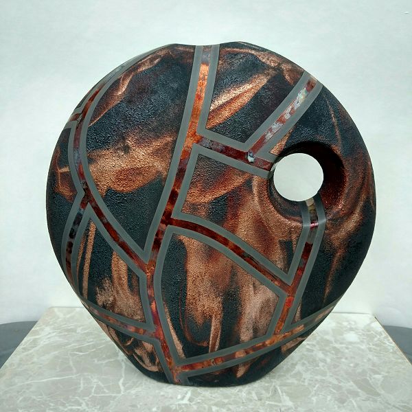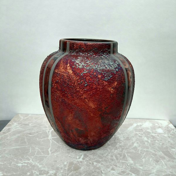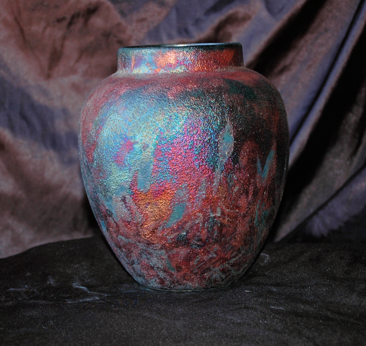 Typically the vessel or piece is fired in our kiln to around 1800 degrees Fahrenheit. We then remove it from the kiln and place it into a garbage can containing newspaper and/or sawdust. At this temperature, the newspaper immediately combusts into flames. We then place the garbage  can lid on the on the can. The fire then quickly burns up all the oxygen in the can creating an oxygen free environment. This is what allows the specially formulated glazes to do their magic. As the piece cools, the different colors and patterns are set. There are so many variables that go into using this firing technique that no piece of raku comes out with the same colors and patterns.