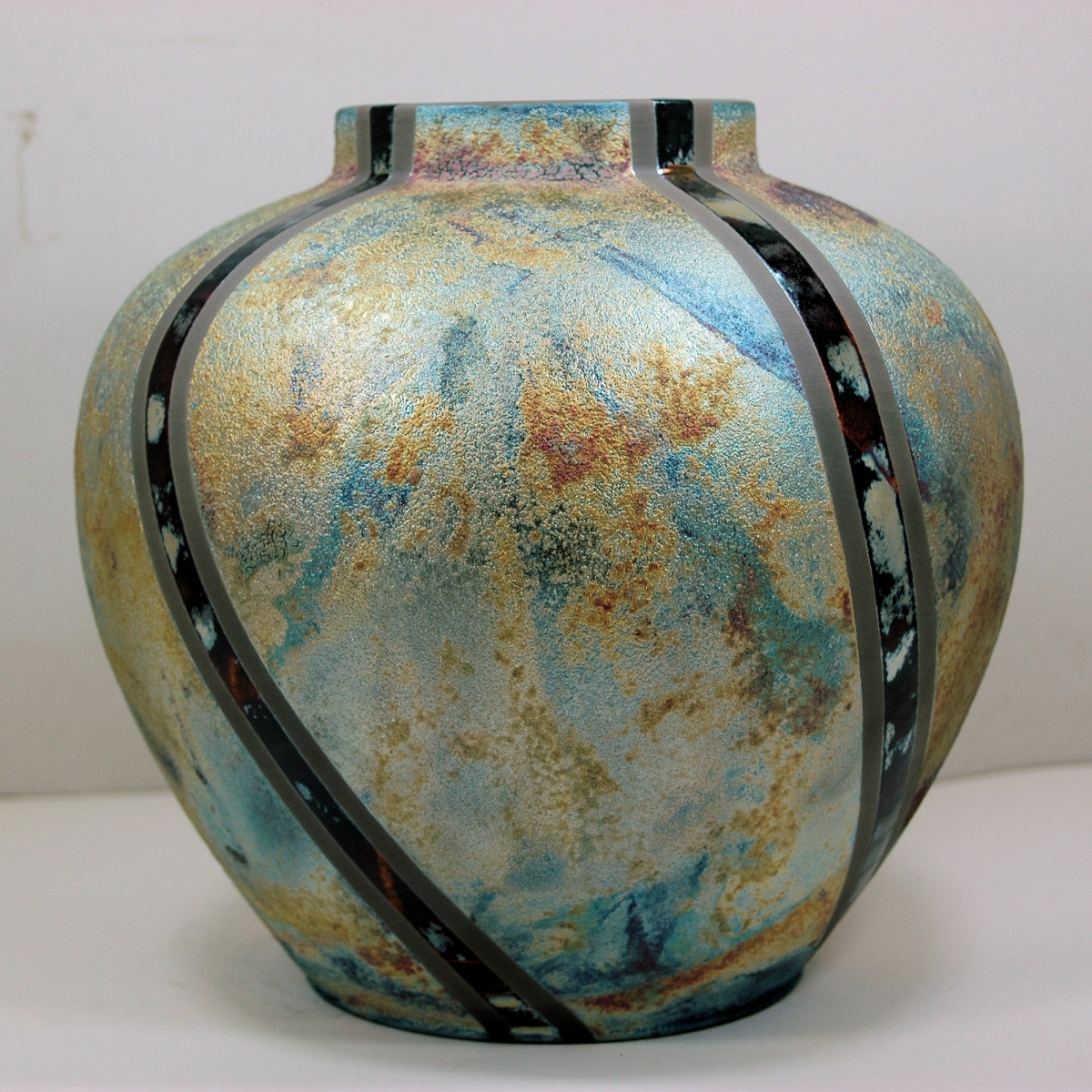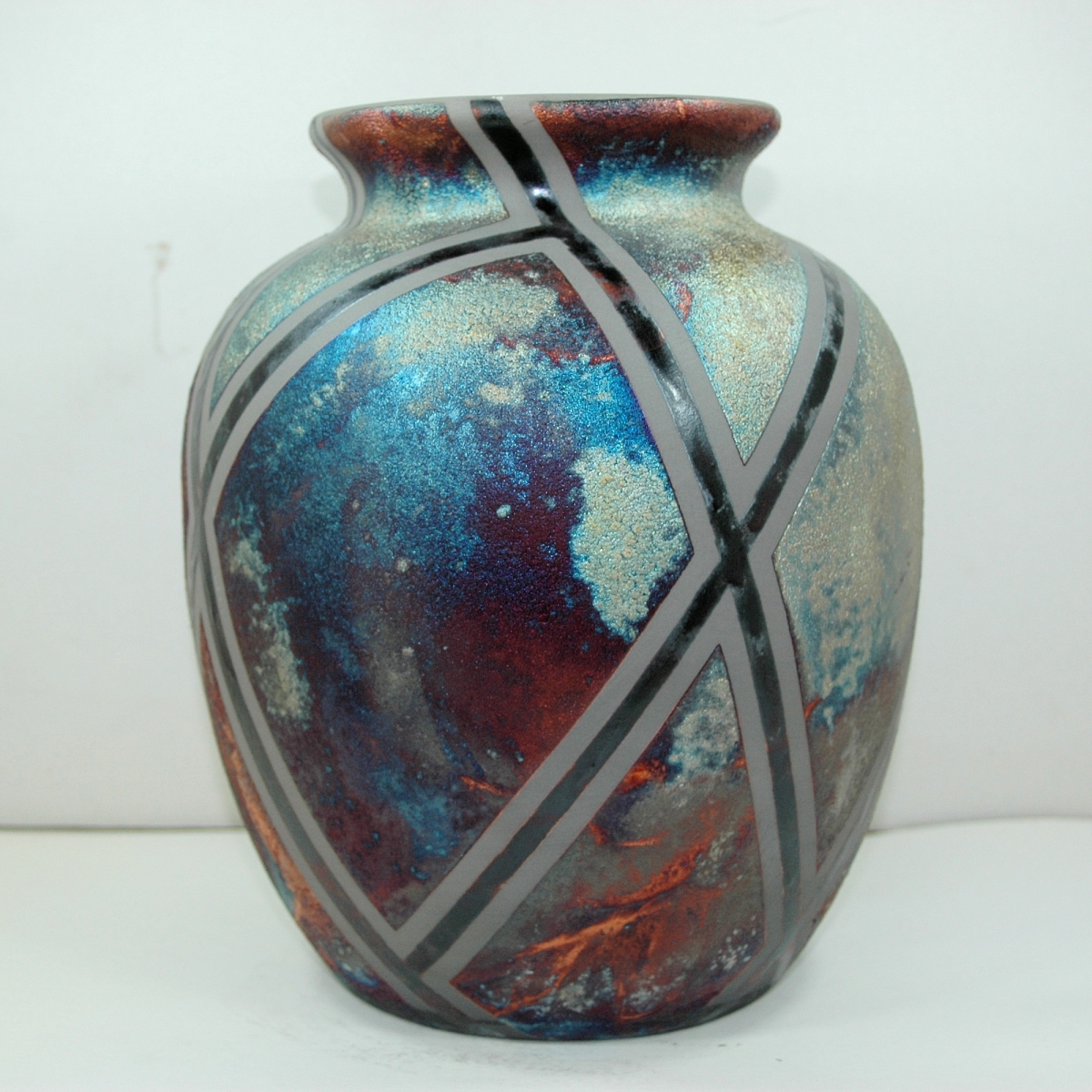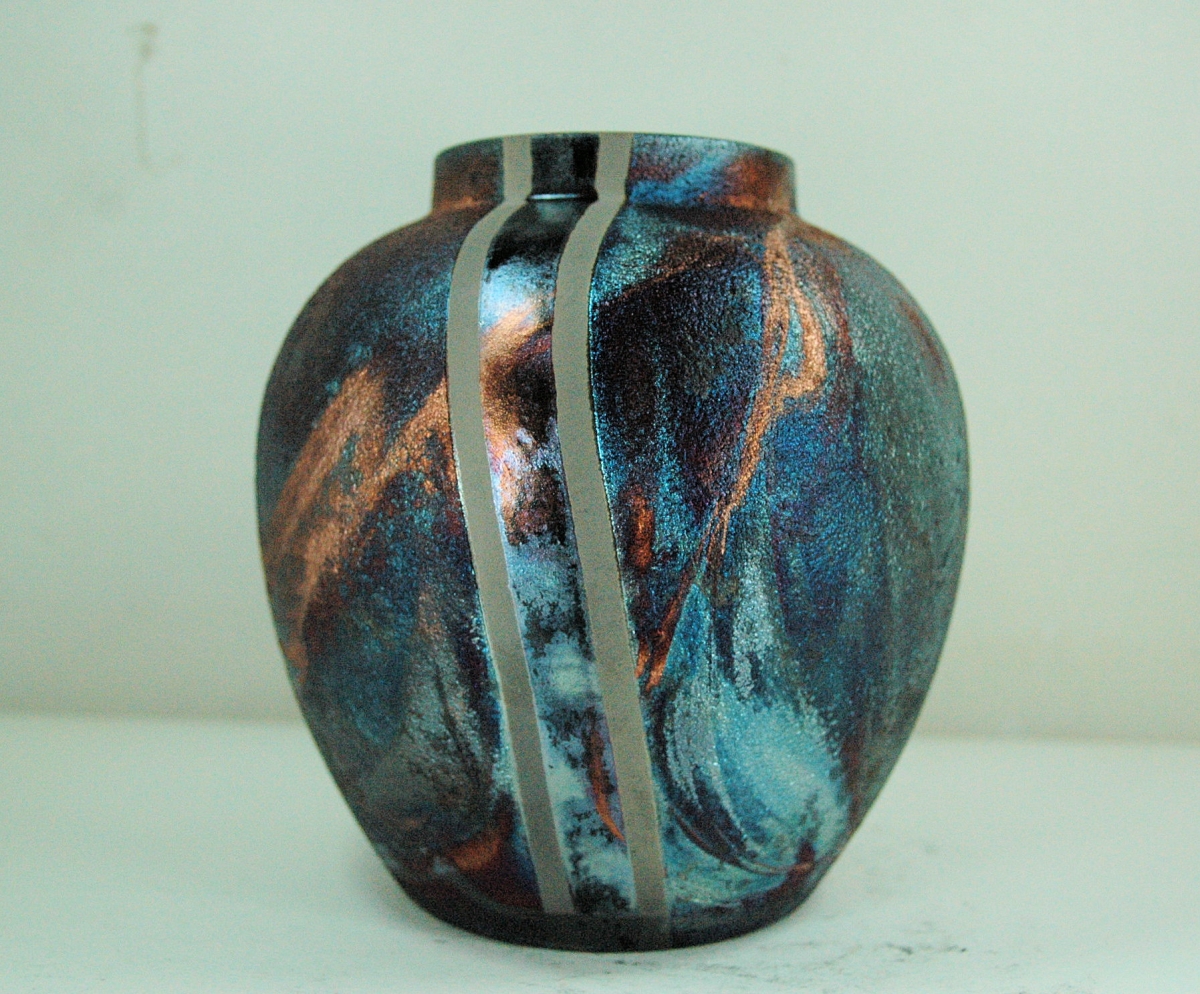 Typically the vessel or piece is fired in our kiln to around 1800 degrees Fahrenheit. We then remove it from the kiln and place it into a garbage can containing newspaper and/or sawdust. At this temperature, the newspaper immediately combusts into flames. We then place the garbage  can lid on the on the can. The fire then quickly burns up all the oxygen in the can creating an oxygen free environment. This is what allows the specially formulated glazes to do their magic. As the piece cools, the different colors and patterns are set. There are so many variables that go into using this firing technique that no piece of raku comes out with the same colors and patterns.