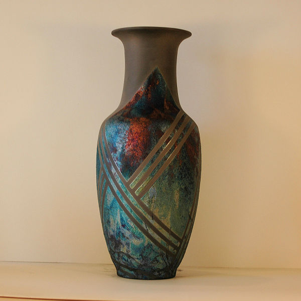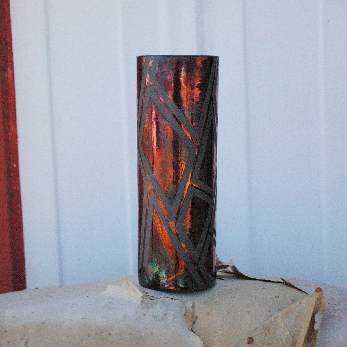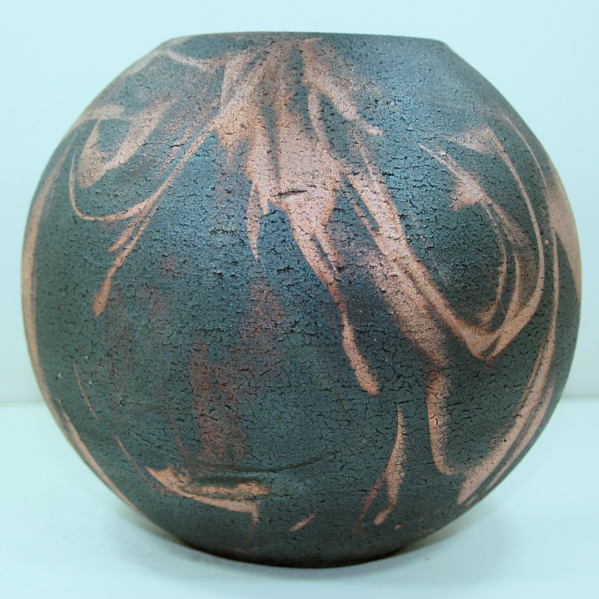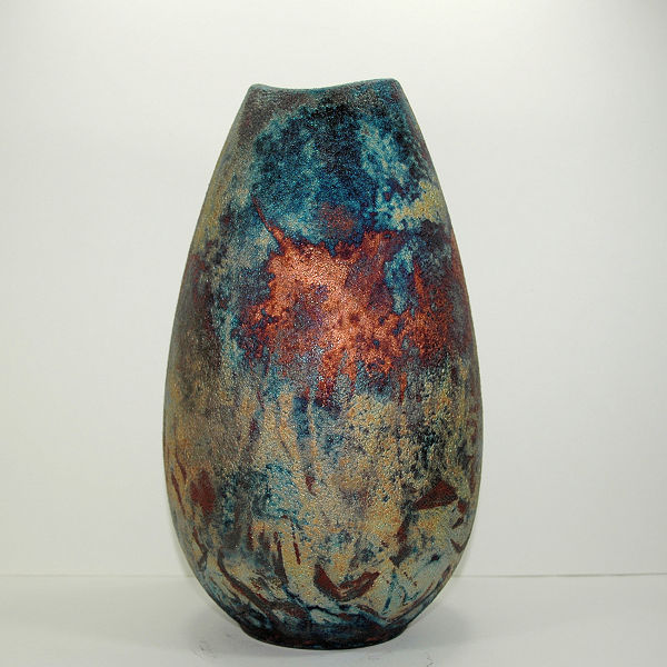 Typically the vessel or piece is fired in our kiln to around 1800 degrees Fahrenheit. We then remove it from the kiln and place it into a garbage can containing newspaper and/or sawdust. At this temperature, the newspaper immediately combusts into flames. We then place the garbage  can lid on the on the can. The fire then quickly burns up all the oxygen in the can creating an oxygen free environment. This is what allows the specially formulated glazes to do their magic. As the piece cools, the different colors and patterns are set. There are so many variables that go into using this firing technique that no piece of raku comes out with the same colors and patterns.